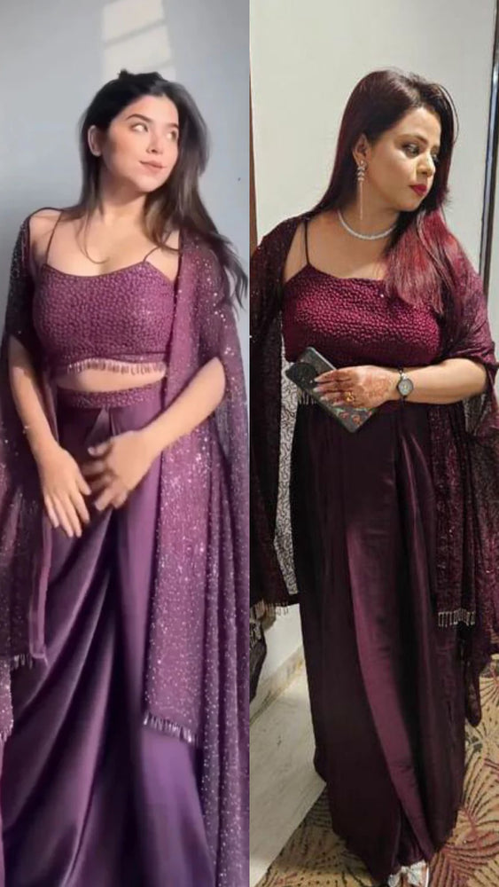 I fell in love with this Velour Wine Drape Ensemble cape set the moment I saw it on Lehenga Bazaar. The fit, the flow, and the soft shimmer everything felt just perfect. The detailing is so elegant and the color makes it look rich yet simple.I wore it for a cocktail, and everyone kept asking where I got it from! It’s super comfortable, easy to c...