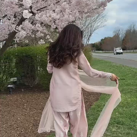 Crafted to embody romance and elegance, this farshi suit is a true statement of timeless charm. The richly adorned kameez features delicate detailing that exudes sophistication, paired with flowing farshi bottoms for a regal silhouette. A contrasting dupatta completes the look with a touch of allure, making it the perfect ensemble for festive evenings, wedding gatherings, and celebratory occasions.