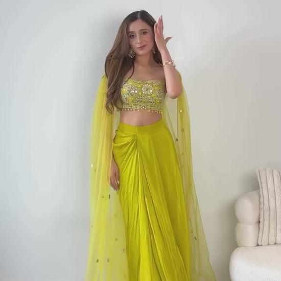 Radiating sunshine charm, the Amber Bloom Drape Set features a vibrant yellow hue with a delicately embellished blouse and flowy drape silhouette. A perfect blend of festive elegance and modern flair, ideal for weddings, haldi, and joyous celebrations.