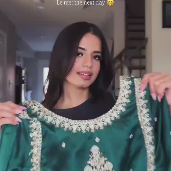Dil-e-Gulnaar Green Anarkali Suit Set, A poetic blend of tradition and elegance, this green Anarkali suit set features intricate thread and sequin work on rich Japan satin. Paired with a flowy micro cotton pant and a delicately embroidered butterfly net dupatta, it brings festive charm and timeless grace to every occasion.