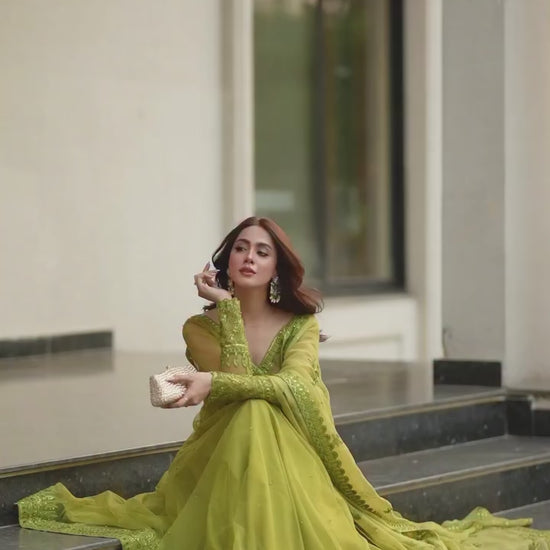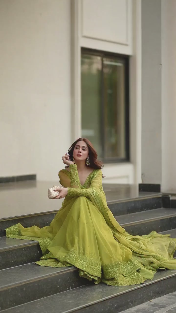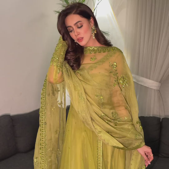 This Hariyali Noor Twirl Set is a vibrant and playful ensemble in lush green tones, featuring a flared, twirl-worthy silhouette adorned with delicate embroidery or prints. Paired with complementing bottoms and a dupatta, it’s perfect for festive celebrations, mehendis, or joyful daytime events.