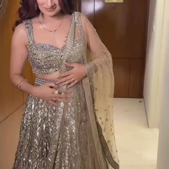 The Husn-e-Zevar Lehenga is an epitome of bridal grandeur, handcrafted in shimmering gold sequins from top to hem. Its luminous design mirrors the brilliance of fine jewelry, making the bride glow like a radiant ornament herself. Every sequin is delicately placed to create a mesmerizing sparkle, while the regal silhouette ensures timeless elegance. Perfect for the bride who wishes to embody royalty and dazzle with unmatched grace on her special day.