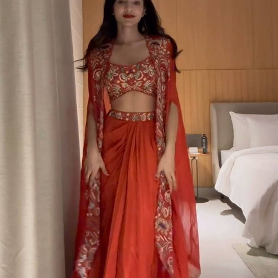 This Kesar Tara Cape Setis a stylish fusion outfit featuring a chic embellished cape paired with a coordinated blouse and flared pants or skirt. With its rich hues and intricate detailing, it’s perfect for festive events, sangeets, or modern wedding functions.