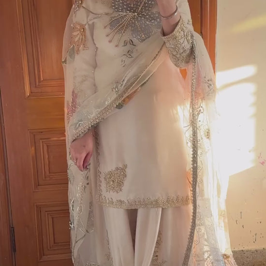 Exude timeless charm in our Nazneen Ivory Sharara Set, a perfect blend of elegance and tradition. Crafted in a luxurious ivory fabric, the outfit is adorned with delicate embroidery and intricate golden accents that add a regal touch. The flowing sharara paired with a richly detailed dupatta creates a silhouette that is both graceful and festive. Whether it’s a wedding celebration, an engagement, or a festive gathering, this ensemble is designed to make you shine with understated sophistication.
