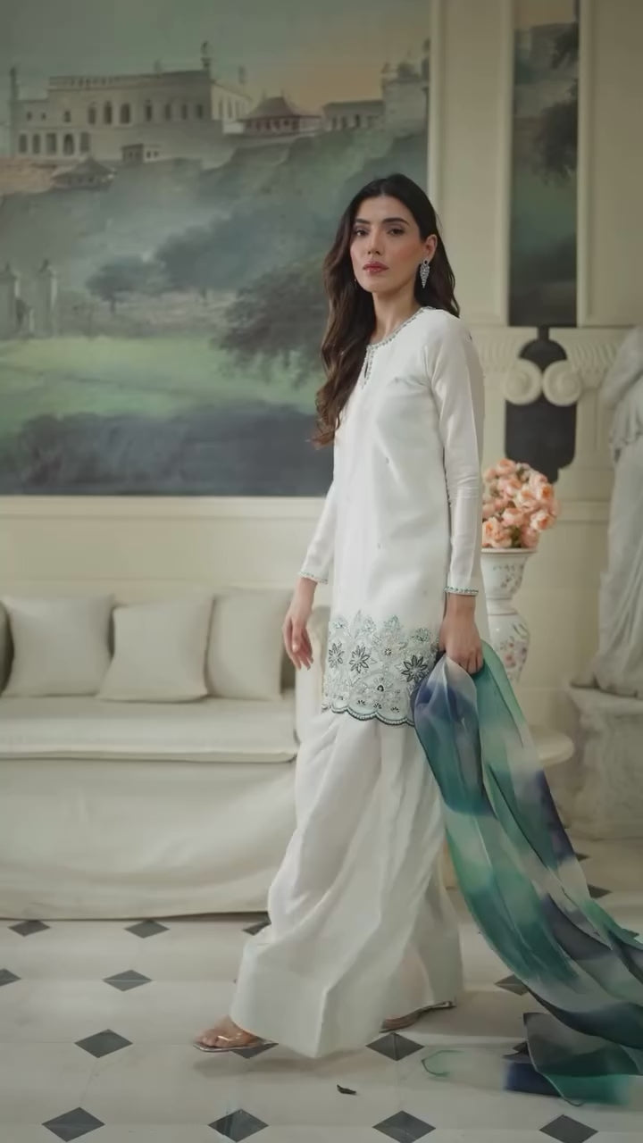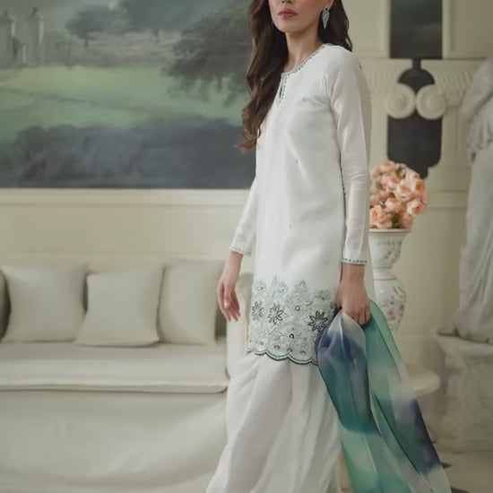 An ode to timeless elegance, this ivory farshi suit is crafted in lustrous fabric with intricate silver embroidery along the hemline. The flowing silhouette paired with a pristine wide-legged farshi bottom creates a regal charm, while the ombré shaded dupatta in teal and navy hues adds a refreshing contrast. Perfect for festive soirées and intimate gatherings, this ensemble blends sophistication with subtle grandeur.
