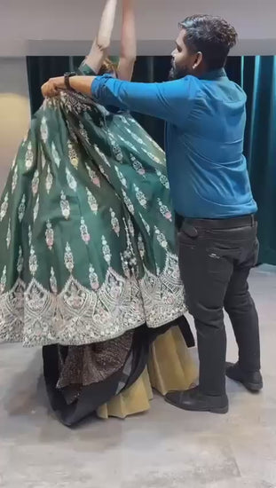 Step into timeless elegance with the Panna Royale Shahi Haara Lehenga Choli. Crafted in rich green faux georgette, this ensemble features exquisite chine stitch embroidery and delicate pearl handwork. The flowing lehenga with 3-meter flair, paired with a beautifully embroidered dupatta, adds a regal touch — perfect for festive occasions, weddings, or grand celebrations.