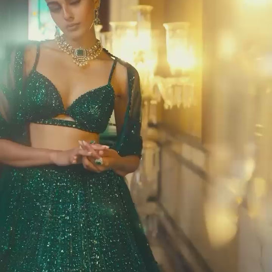 Royal Emerald Radiance Lehenga: A dazzling emerald green lehenga featuring all-over sequin embellishments, paired with a chic bralette-style blouse. Perfect for modern brides or glamorous evening events.