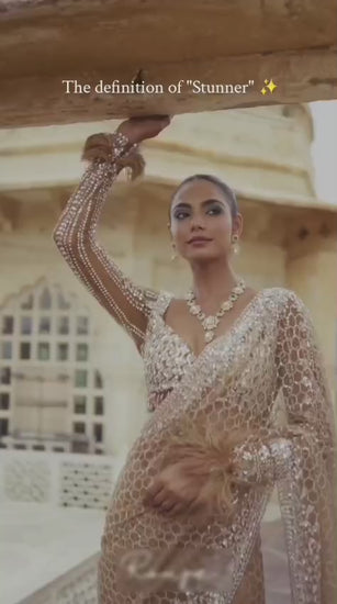 Royal Radiance Net Saree, Drape yourself in timeless elegance with this exquisite golden net saree. Featuring intricate embroidery and delicate sequin work, it captures the essence of royal grandeur and festive charm. Perfect for special occasions where you want to shine with grace and sophistication.
