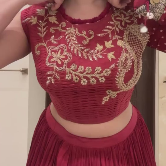The Ruby Reverie Shrug Lehenga Set features a rich maroon lehenga adorned with intricate embroidery and paired with a stylish shrug for a modern twist. Crafted for elegance and comfort, this ensemble is perfect for festive occasions and weddings where you want to make a statement.