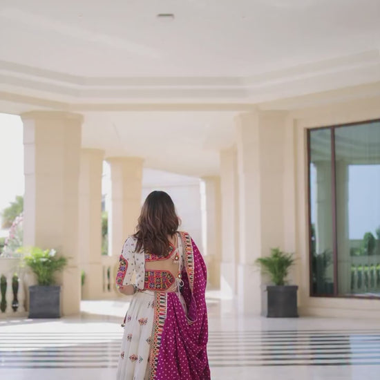 Celebrate the rhythm of Navratri with this graceful white lehenga, beautifully adorned with colorful polka-dot inspired mirror work that sparkles with every twirl. Paired with a vibrant pink dupatta, it brings the perfect pop of festivity while keeping the look elegant and playful. Lightweight and flowy, this lehenga is designed for effortless dancing and timeless charm.
