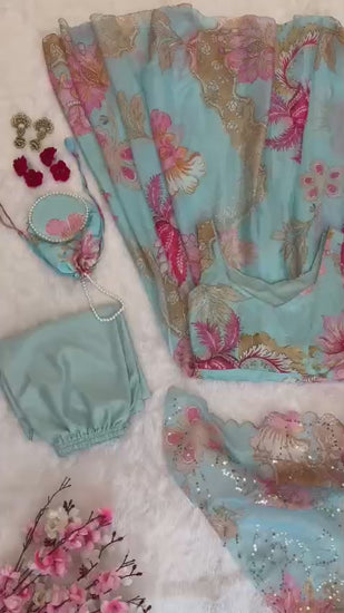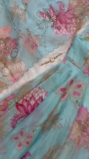 FABRIC: Pure Jimmy Organza Silk Digital Printed, Padded Anarkali With Mirror Work On The Neckline.