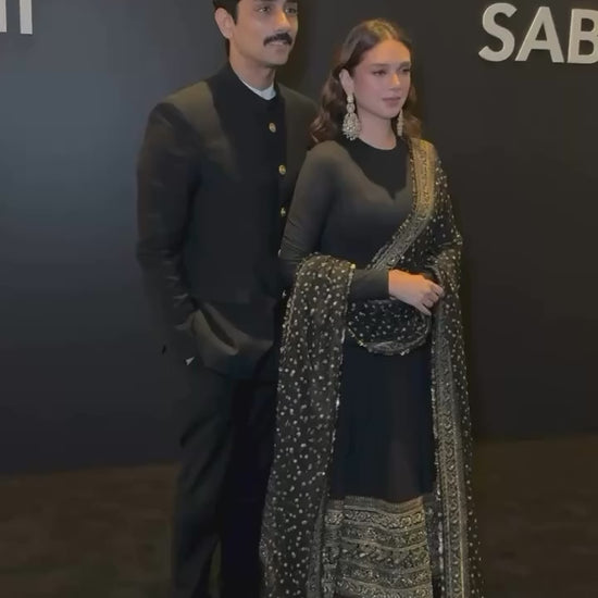 This Zohra Black Royal Set is a striking ensemble exuding timeless elegance, featuring a richly embellished black kurta paired with regal bottoms and a complementing dupatta. With its luxurious detailing and bold silhouette, it's perfect for grand celebrations, evening events, or festive occasions.